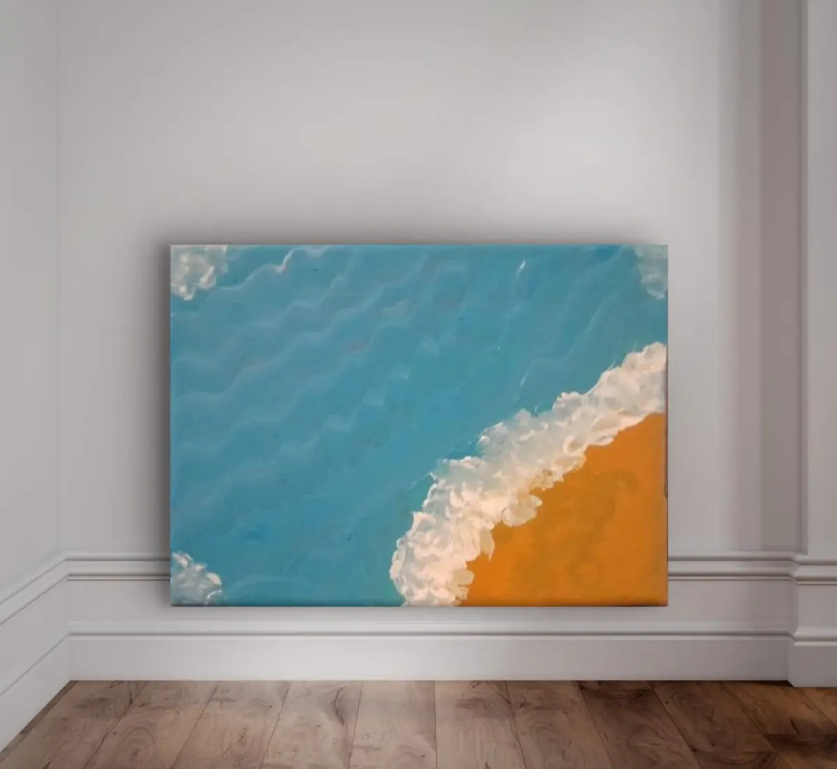 Un paisaje visto desde arriba se transforma en una experiencia sensorial: el azul profundo se ondula como un mar en constante respiración; en el centro, la espuma blanca irrumpe con energía, marcando el instante exacto en que el agua toca la tierra; abajo, un tono cálido y arenoso se extiende como un territorio quieto que recibe la fuerza del oleaje. La obra captura el diálogo entre fluidez y quietud, entre avance y reposo, invitando a contemplar el ritmo natural de un borde que nunca es el mismo.