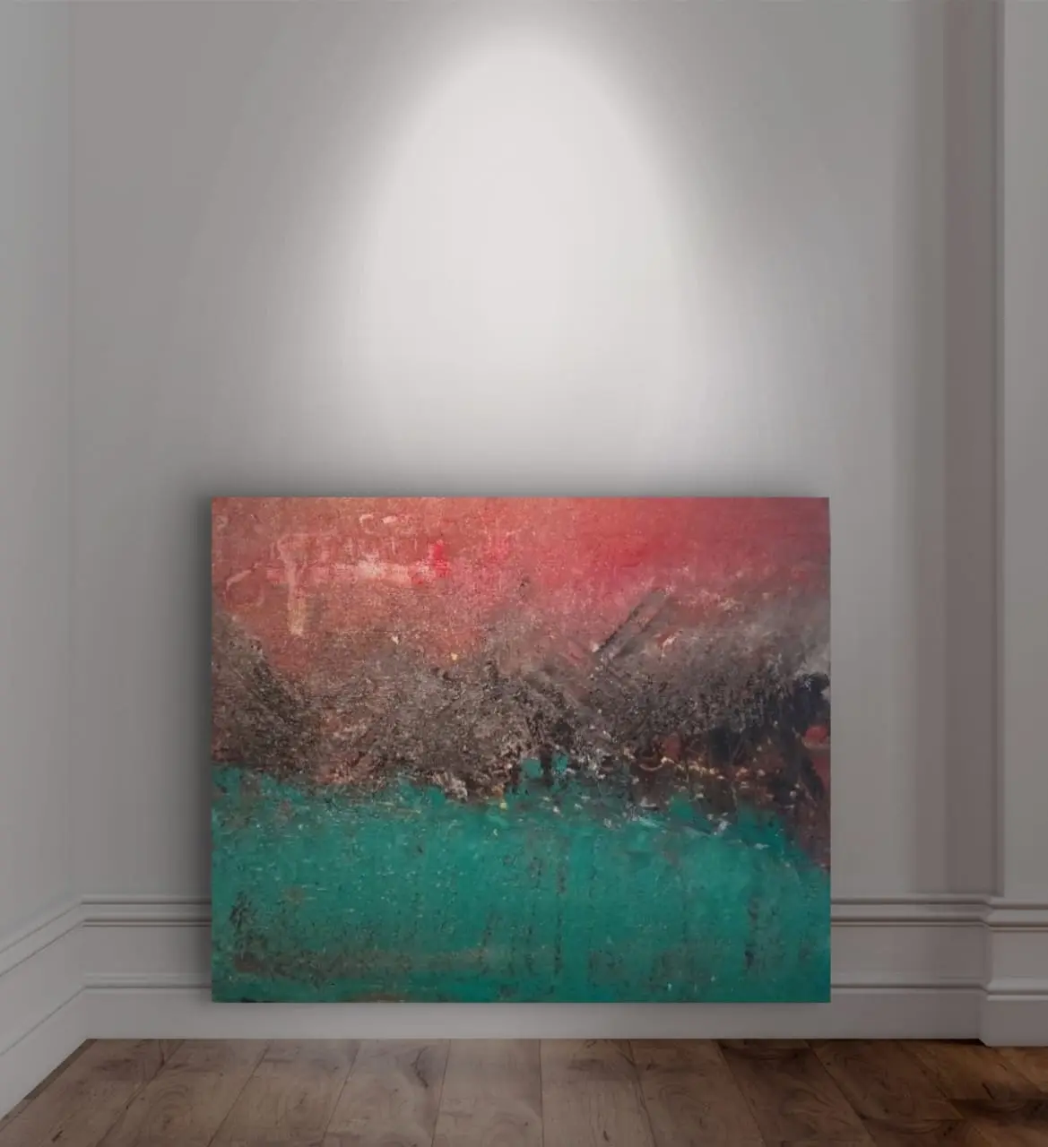 Tres fuerzas cromáticas conviven en tensión y armonía dentro de un mismo plano. En la parte superior, un rojo vibrante respira como una superficie cálida y expansiva; en el centro, una franja oscura y densa concentra la materia, creando un territorio rugoso que parece latir; abajo, un turquesa profundo se abre como un espacio líquido que sostiene, refleja y equilibra. La obra captura el instante en que la energía asciende, se condensa y vuelve a fluir, invitando a contemplar el movimiento interno de la materia y sus transiciones.