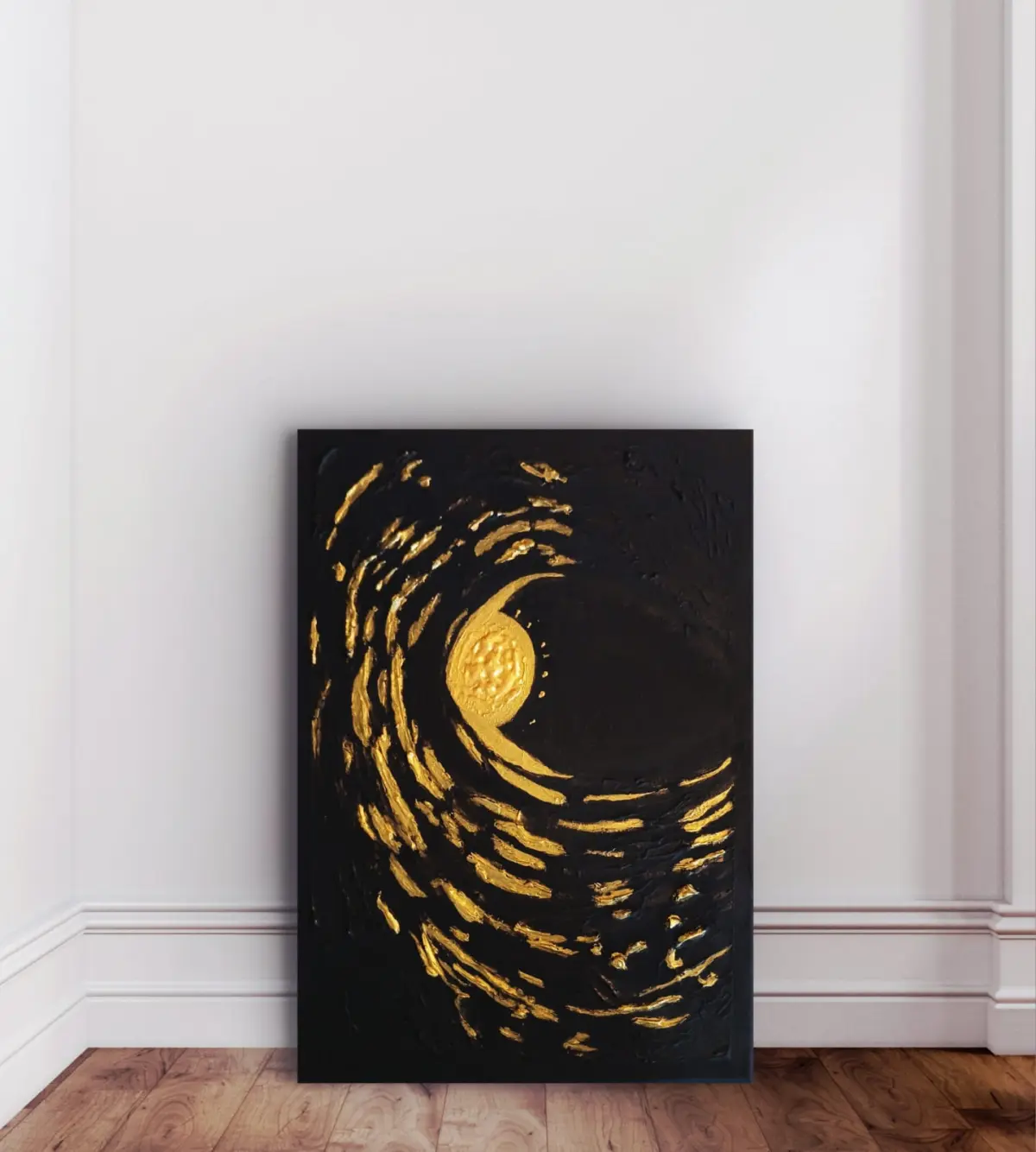 Una espiral de luz emerge desde un centro dorado que parece latir en la oscuridad. El negro profundo sostiene el brillo metálico, mientras los trazos circulares se expanden como ondas de energía o memorias que buscan forma. La obra combina misterio, ritmo y una presencia casi ritual, invitando a contemplar el movimiento silencioso de lo que nace desde adentro.