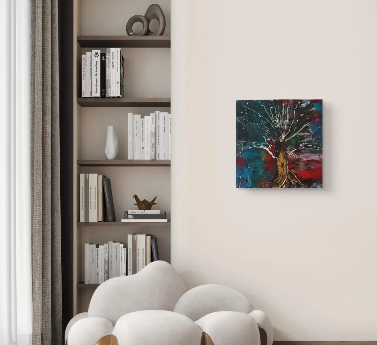 Una figura arbórea emerge entre colores intensos, como si la luz buscara abrirse paso a través del caos cromático. Las ramas blancas se expanden con delicadeza mientras el fondo rojo, azul y verde vibra en contraste, generando una tensión entre calma y energía. La obra combina gesto, símbolo y emoción, invitando a contemplar un paisaje interior más que uno literal.