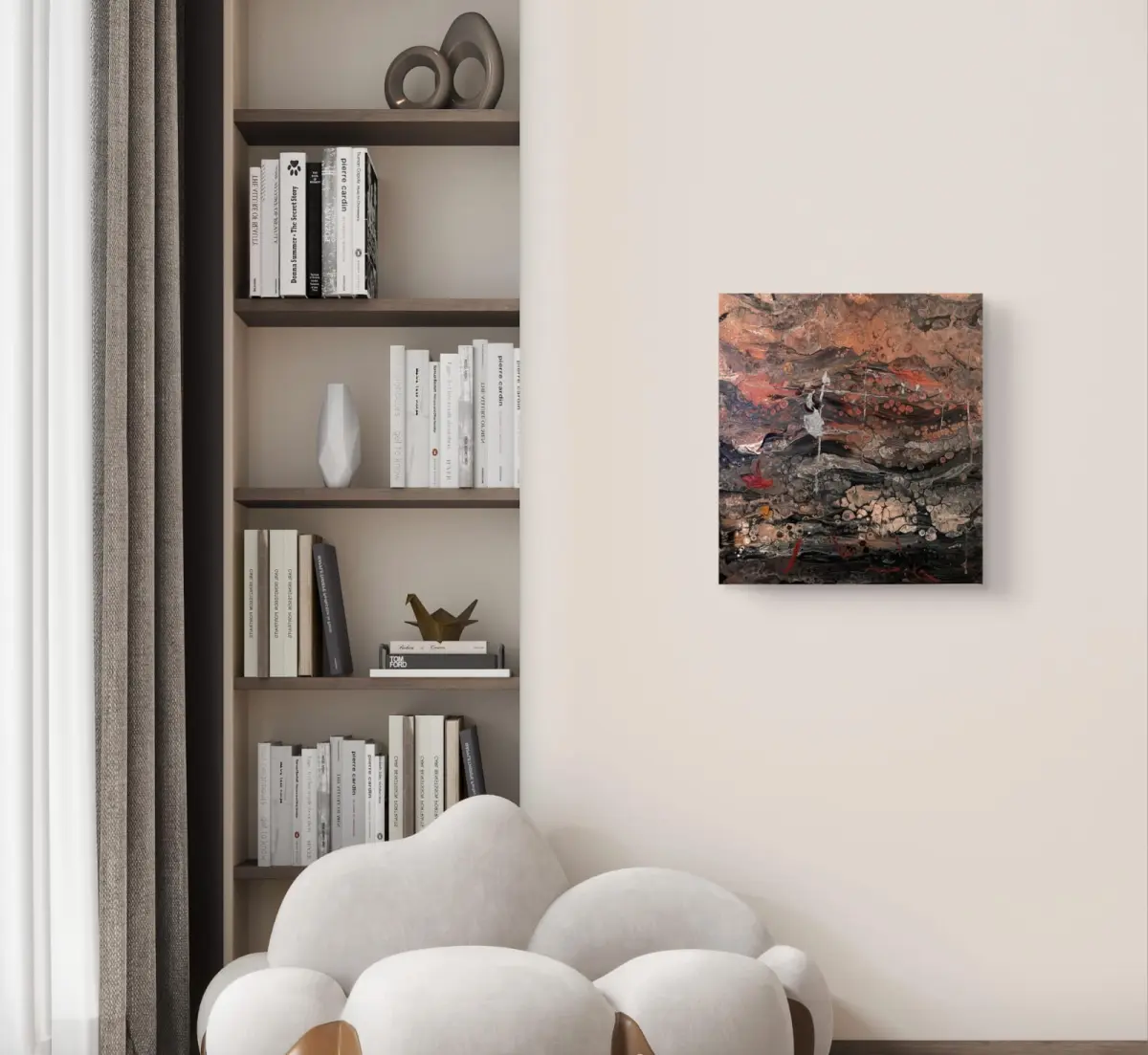 Una composición de tonos terrosos donde el color se asienta en estratos. Rojos profundos, negros, ocres y beige se superponen en texturas que evocan materia, tiempo y huella. La obra sostiene una tensión entre lo orgánico y lo geométrico, como si cada bloque de color revelara un fragmento de un paisaje interior. Su presencia es sobria pero intensa, invitando a una contemplación silenciosa.