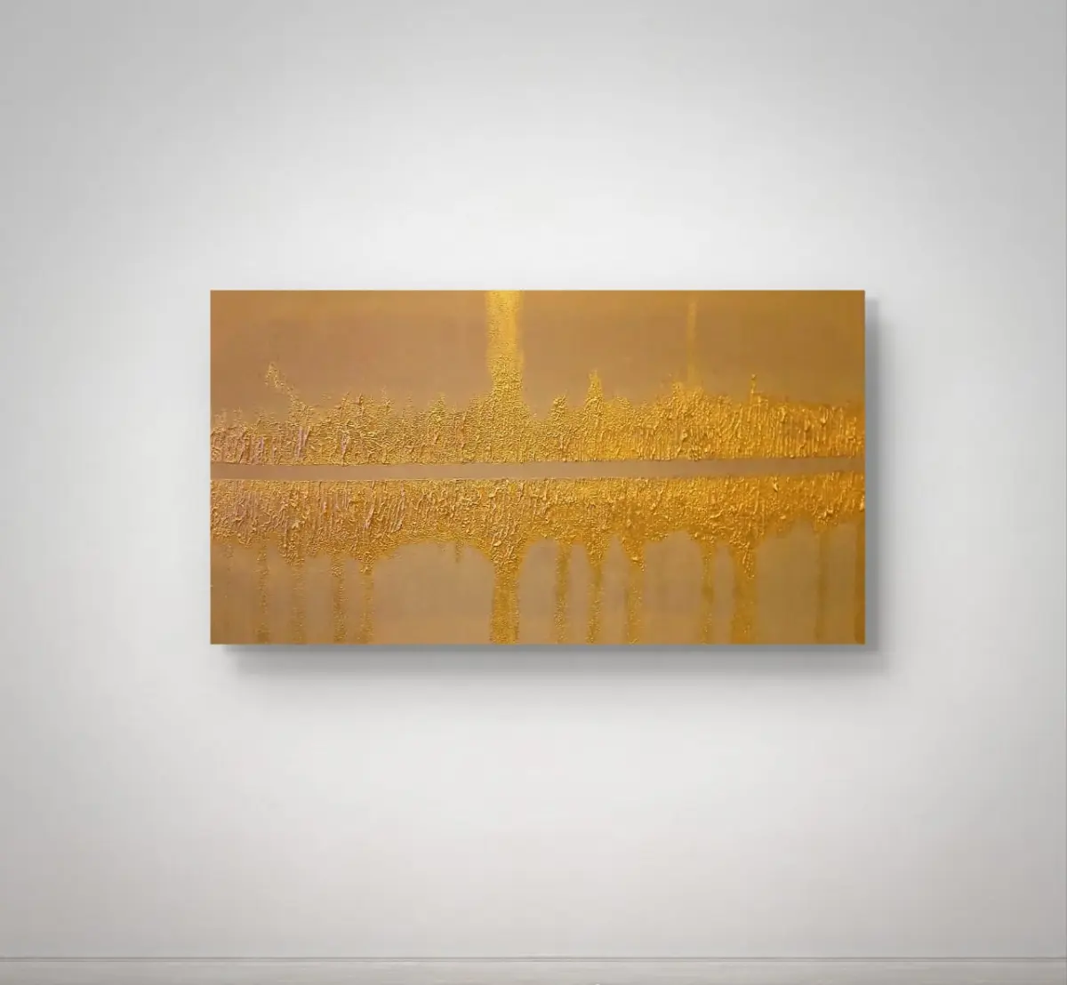 Una franja de luz metálica divide el espacio como un horizonte detenido en el tiempo. Arriba, las texturas se alzan en formas irregulares que evocan un relieve vibrante; abajo, esas mismas formas parecen derretirse en un reflejo líquido. El oro domina la escena con una presencia cálida y solemne, creando un equilibrio entre solidez y disolución. La obra invita a contemplar el límite entre lo que emerge y lo que cae, entre lo que brilla y lo que se desvanece.