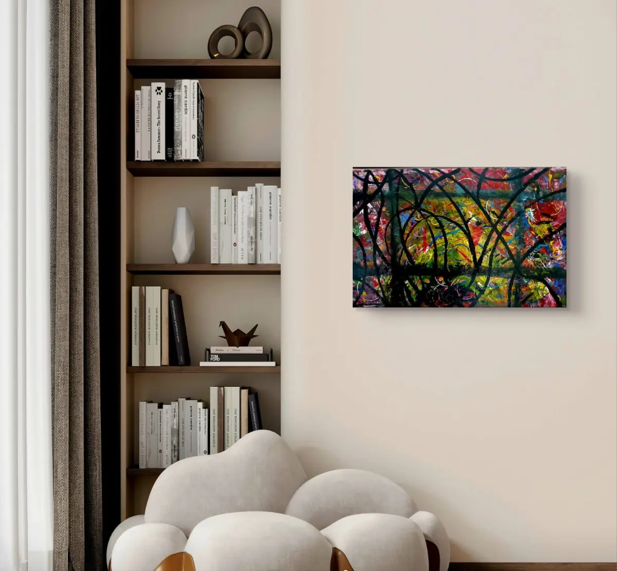 Una composición vibrante donde los colores se entrecruzan en un gesto expansivo. Amarillos, rojos, verdes y púrpuras se deslizan sobre el fondo, atravesados por líneas negras que tensan y organizan el movimiento. La obra respira dinamismo: cada trazo parece avanzar, chocar, abrir un nuevo camino. Es una pieza que irradia vitalidad y transforma el espacio con su ritmo visual.